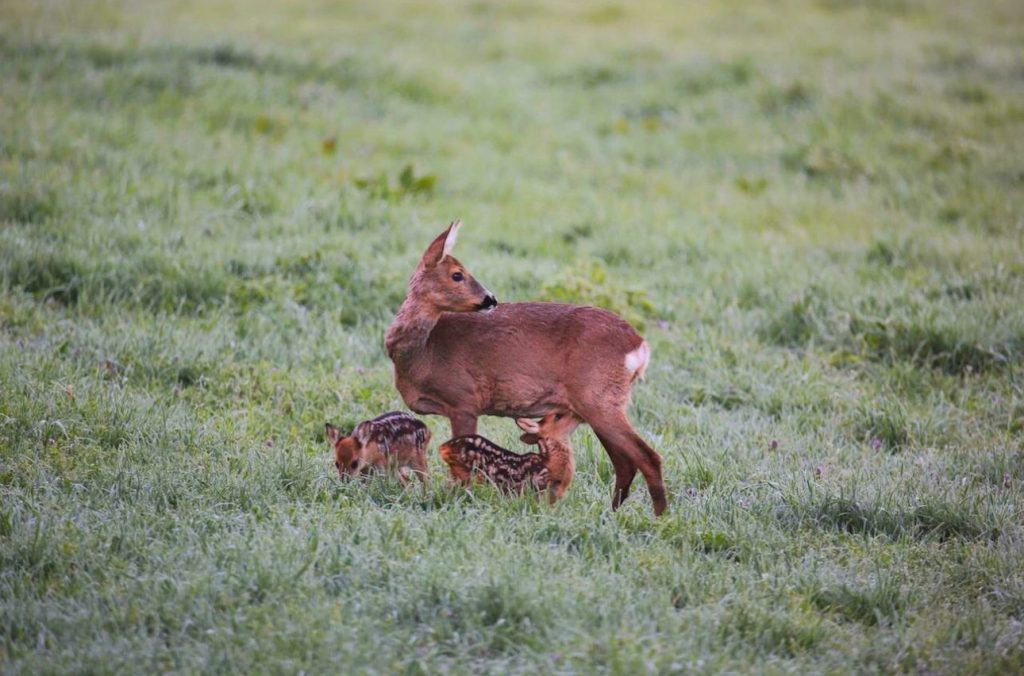 Diese Ricke ist ca. 2-3 Wochen früher dran, als die meisten anderen und es zeigt, dass bereits jetzt Ende April vor der Mahd nach Kitzen gesucht werden muss.
