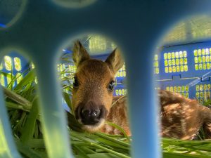 An dem Termin stellt bitte mindestens einen Helfer und Material zum aufbewahren der Kitze bereit. Bewährt hat sich, die Kitze mit Wäschekörben, Klappboxen oder ähnlichem im Schatten am Feldrand festzusetzen. Denkt auch daran, dass ihr die Kitze nach der Mahd wieder freilassen müsst. Optimal ist es, wenn der Schnitt direkt nach dem Einfangen der Kitze erfolgt, damit sie nicht lange von der Ricke getrennt sind.